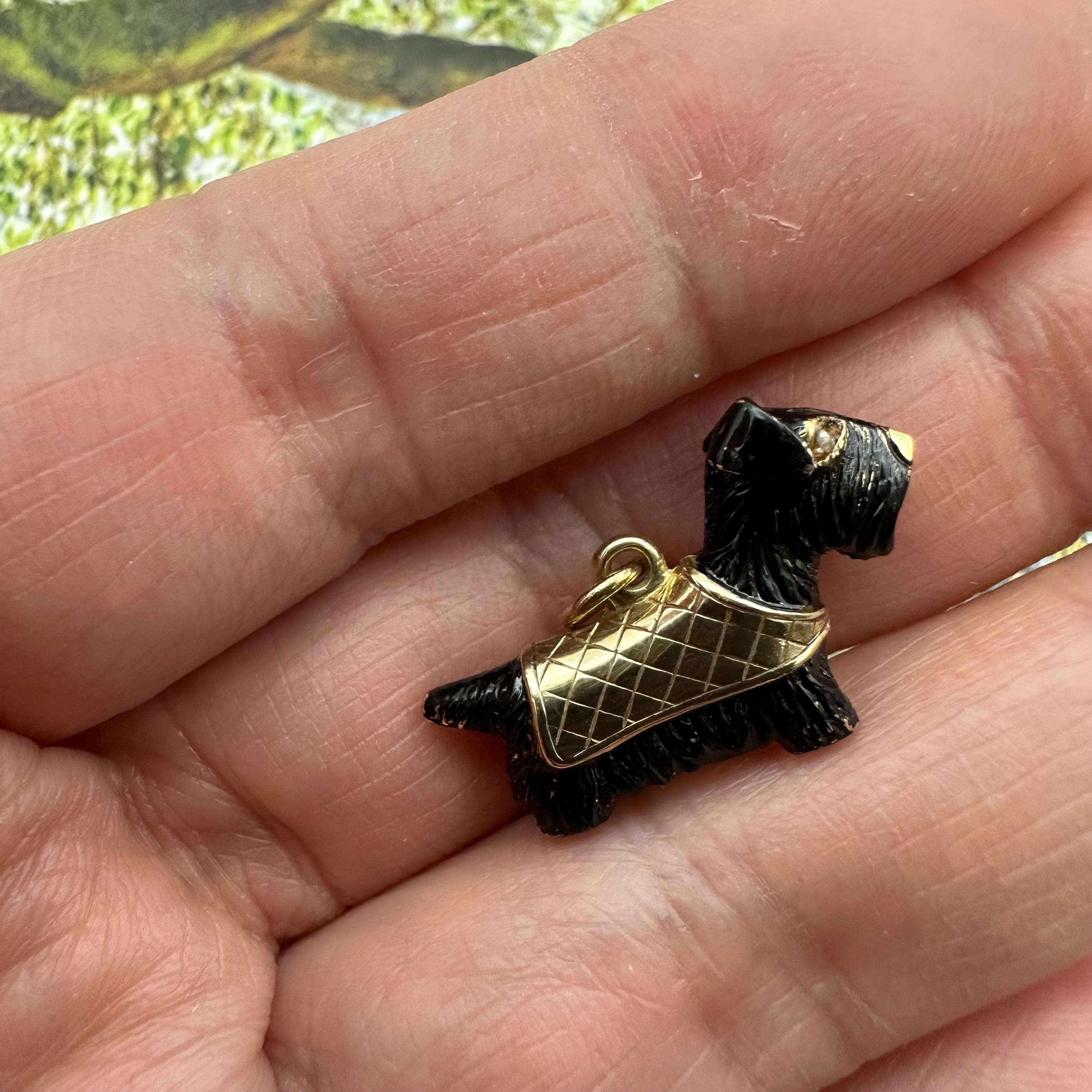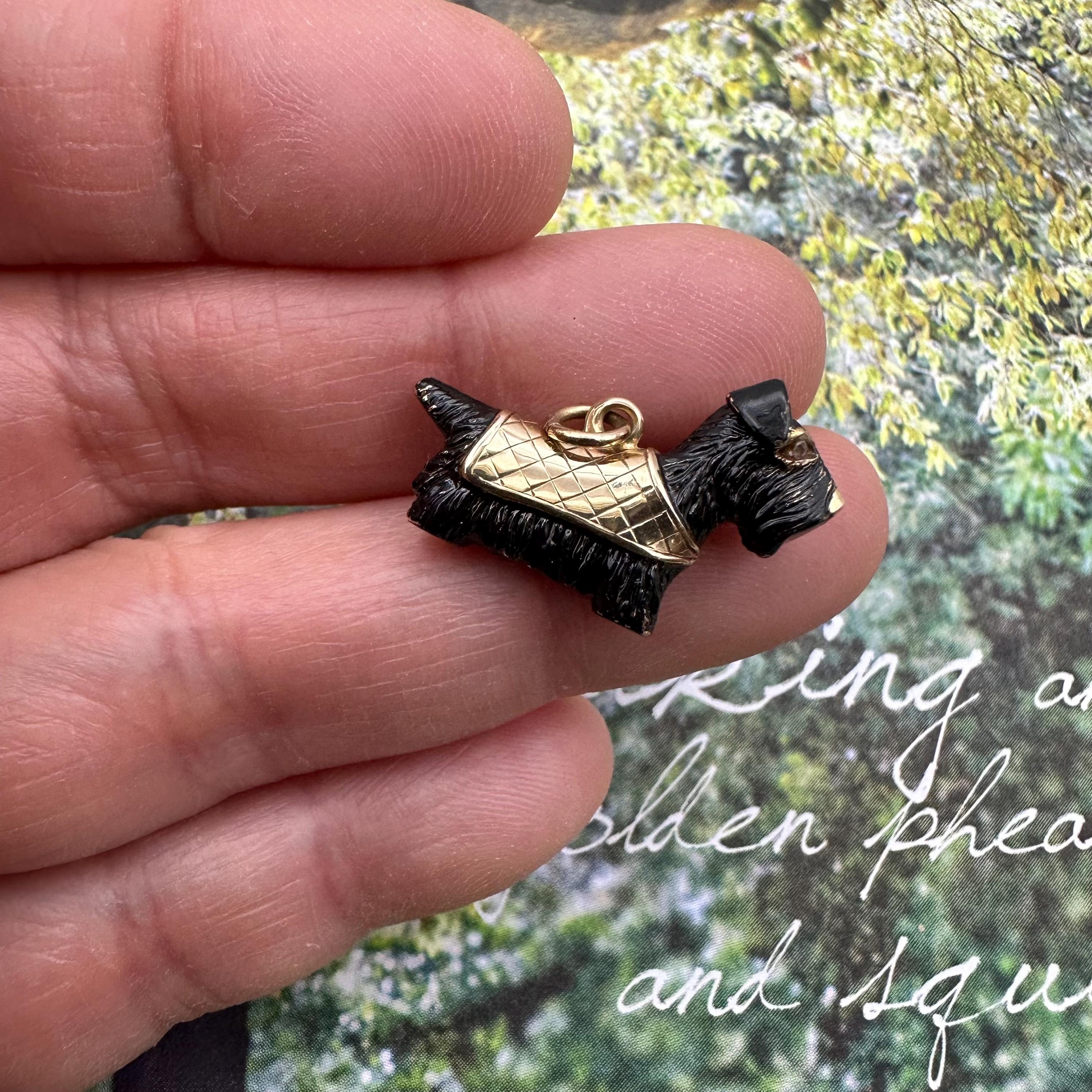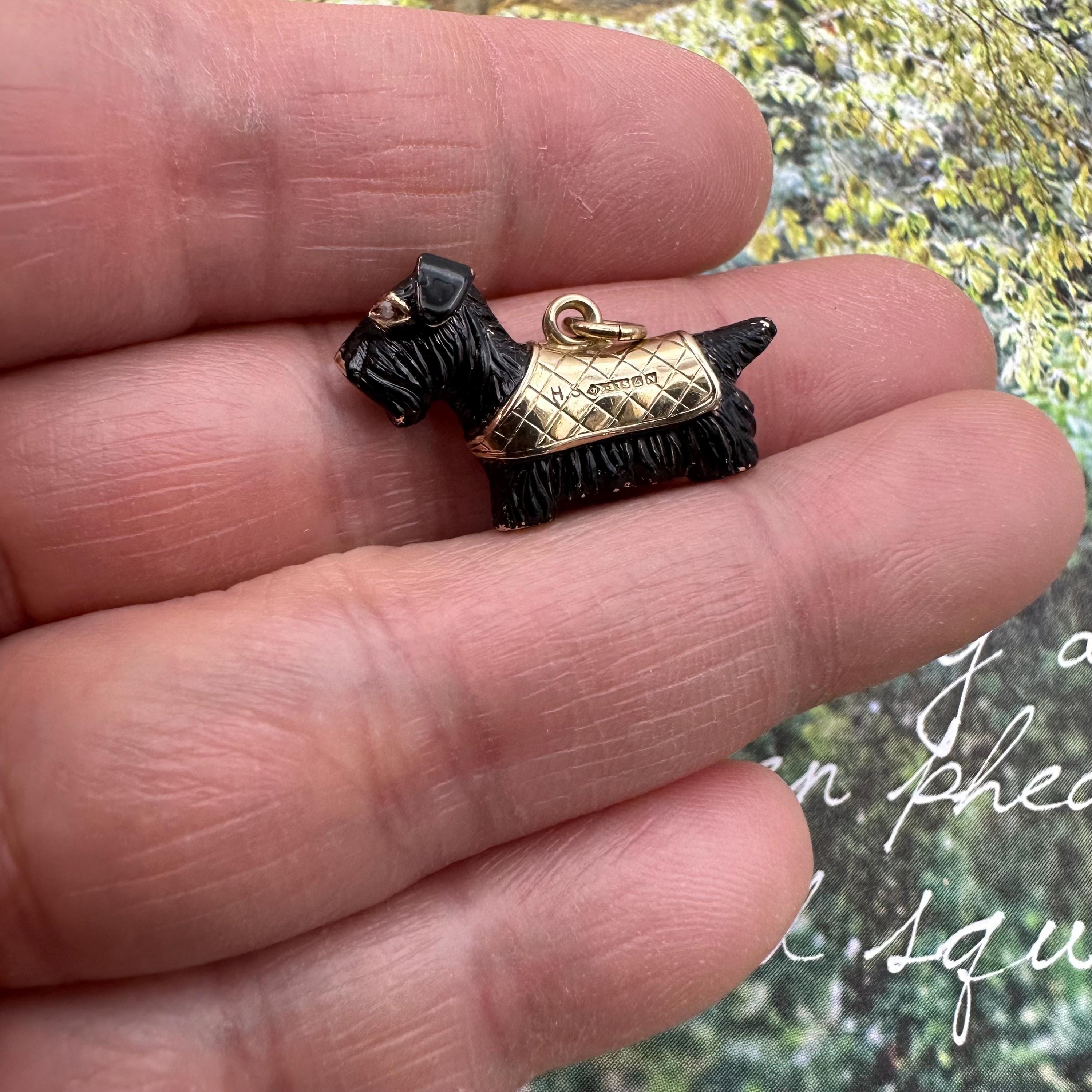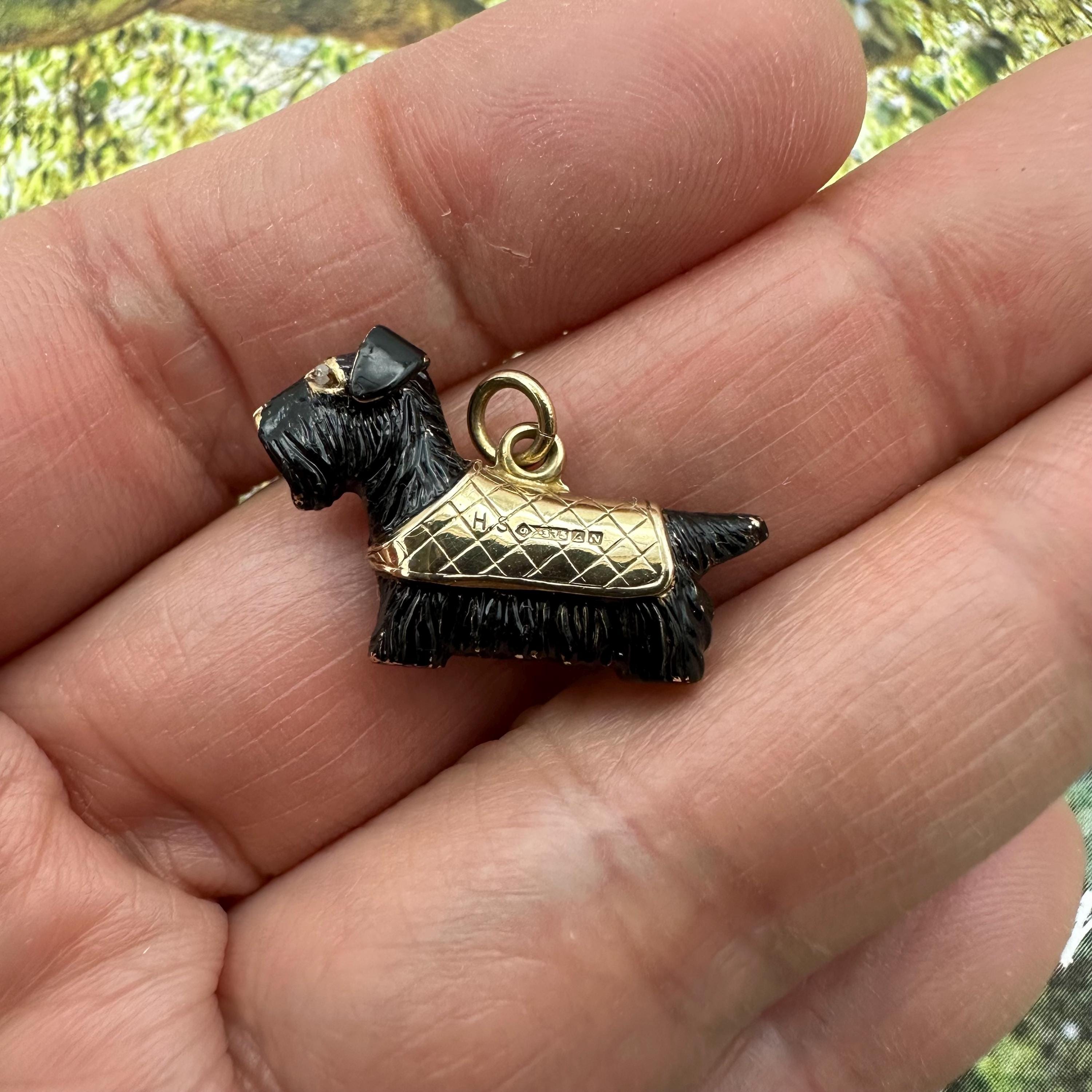 Adorable!! This little Scottish Terrier is carved out from 9ct gold, circa 1960s. It has two sparkly rough cut natural diamond eyes and wear a plaid cap coat. It is fully hallmarked on the cape. Condition is very good with some losses of enamel here and there. This is normal for a vintage piece. Please see pics and video.