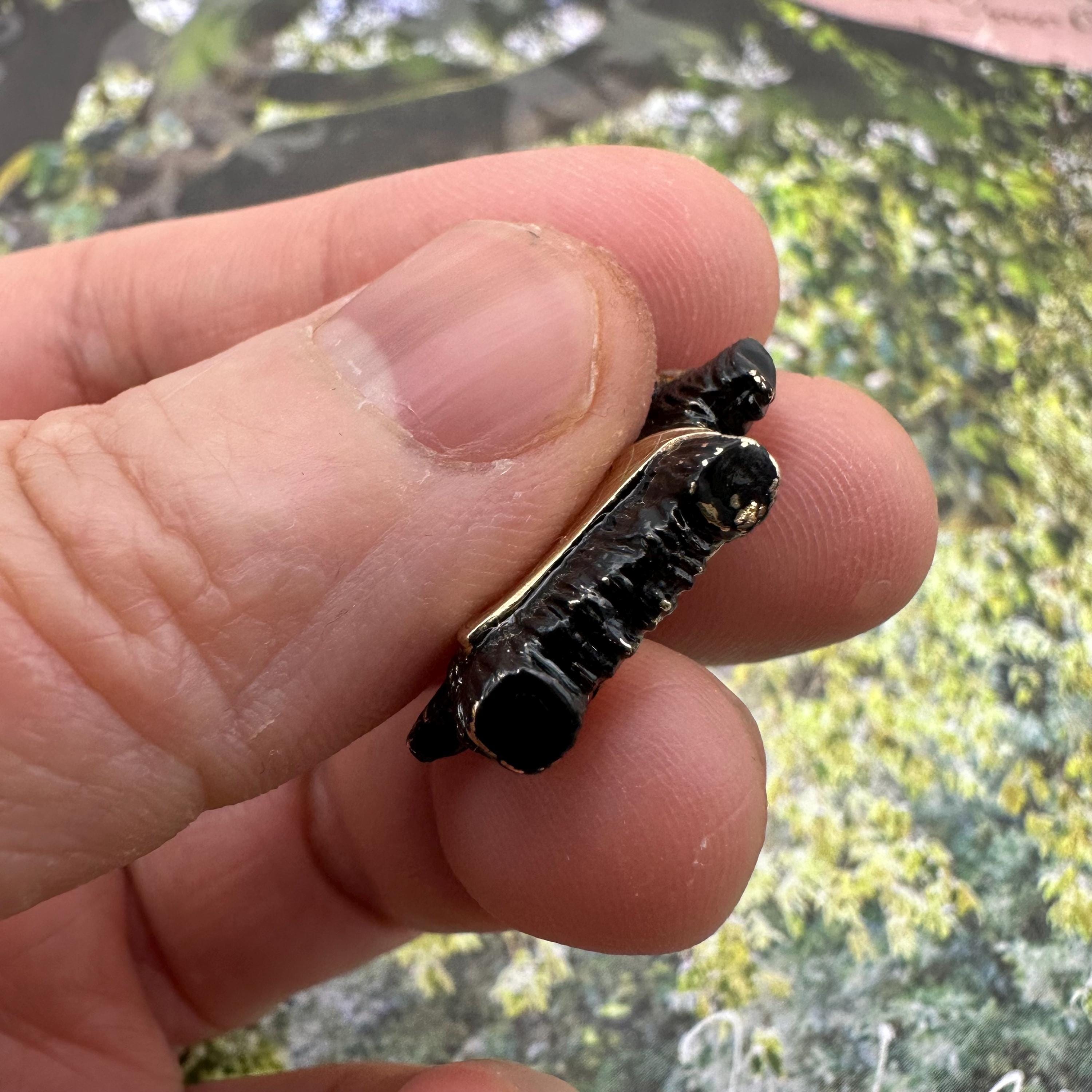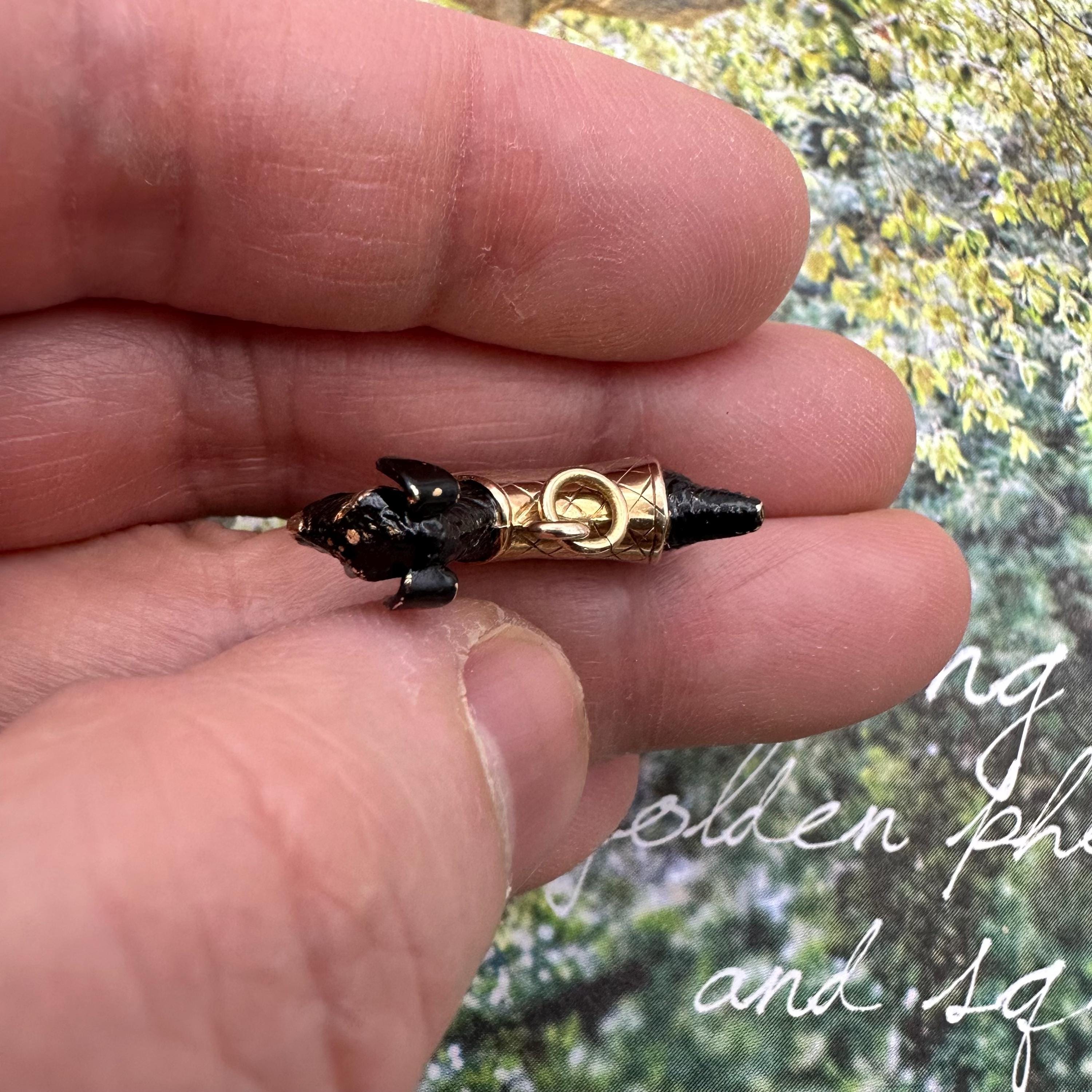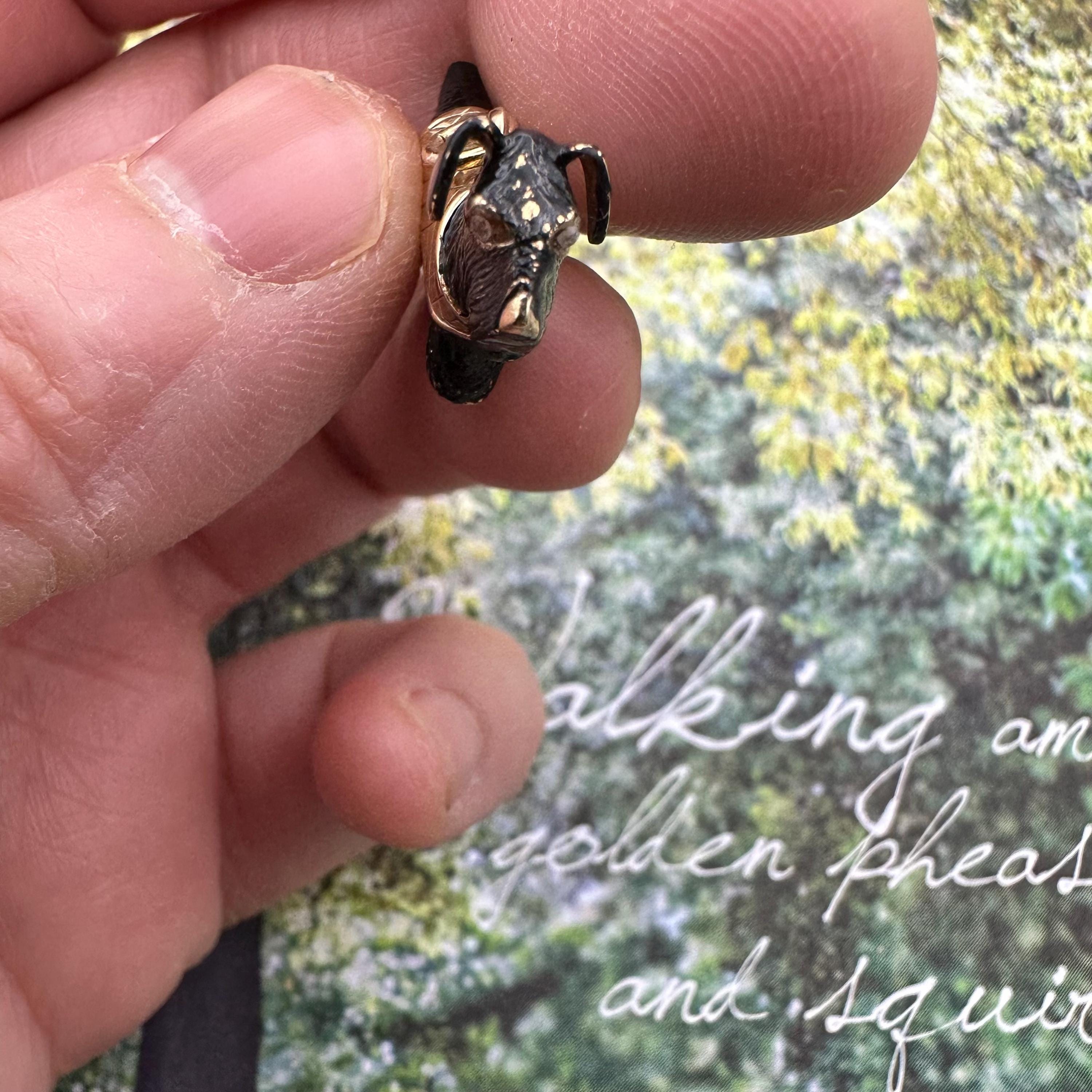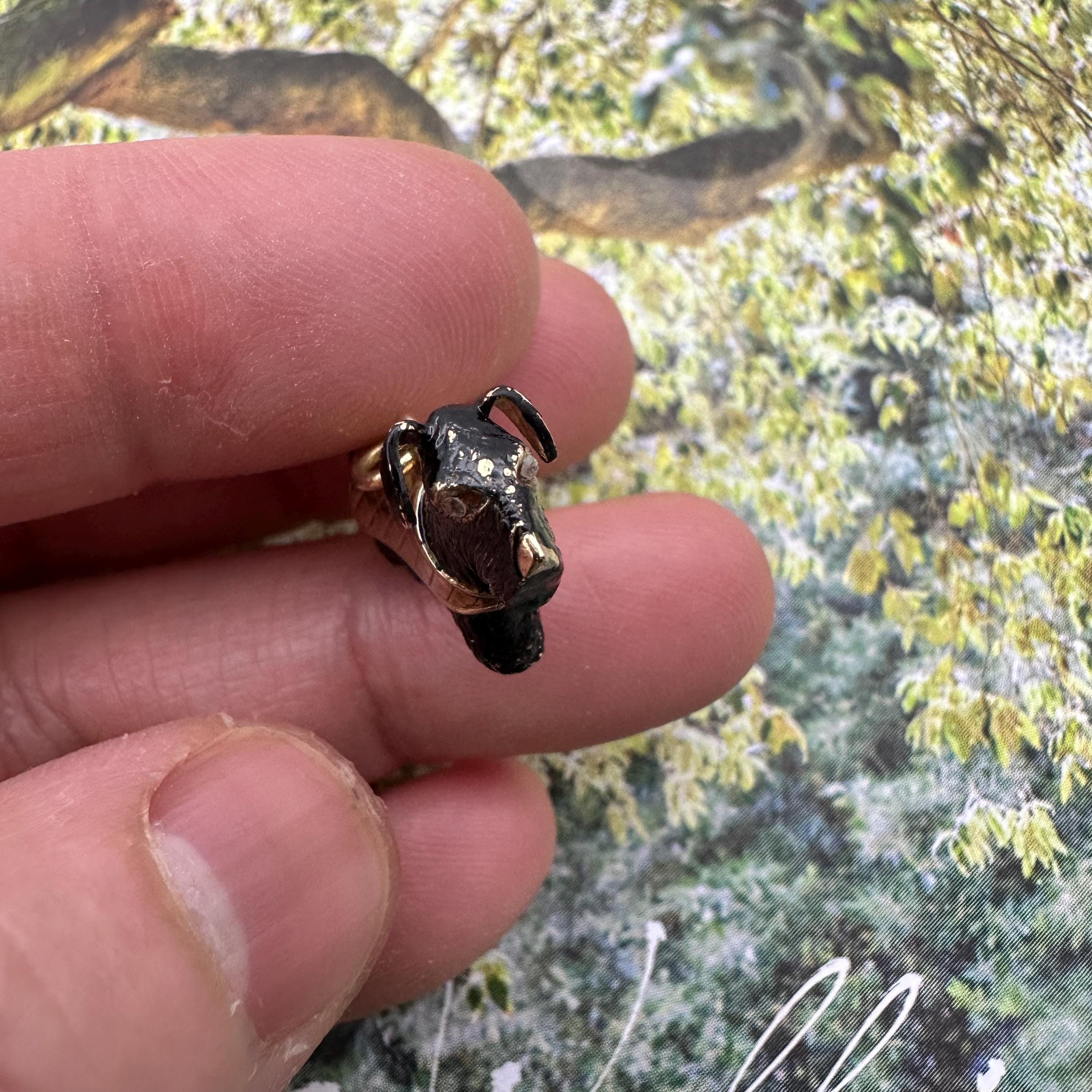 Adorable!! This little Scottish Terrier is carved out from 9ct gold, circa 1960s. It has two sparkly rough cut natural diamond eyes and wear a plaid cap coat. It is fully hallmarked on the cape. Condition is very good with some losses of enamel here and there. This is normal for a vintage piece. Please see pics and video.