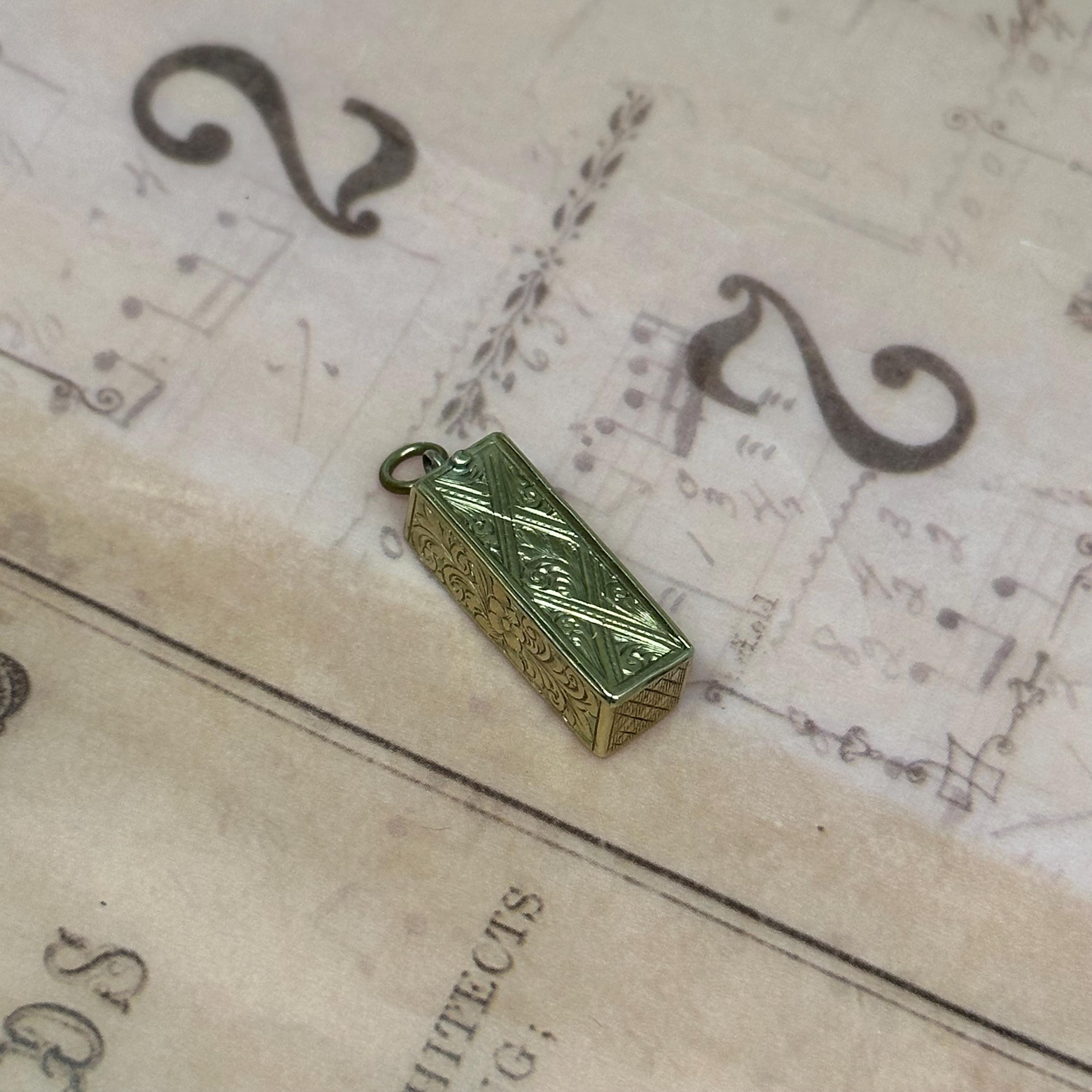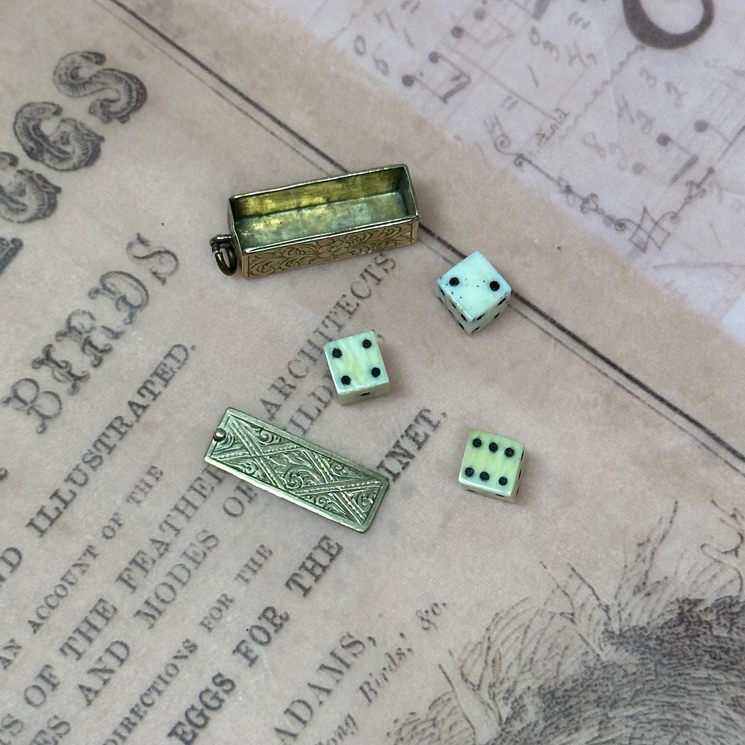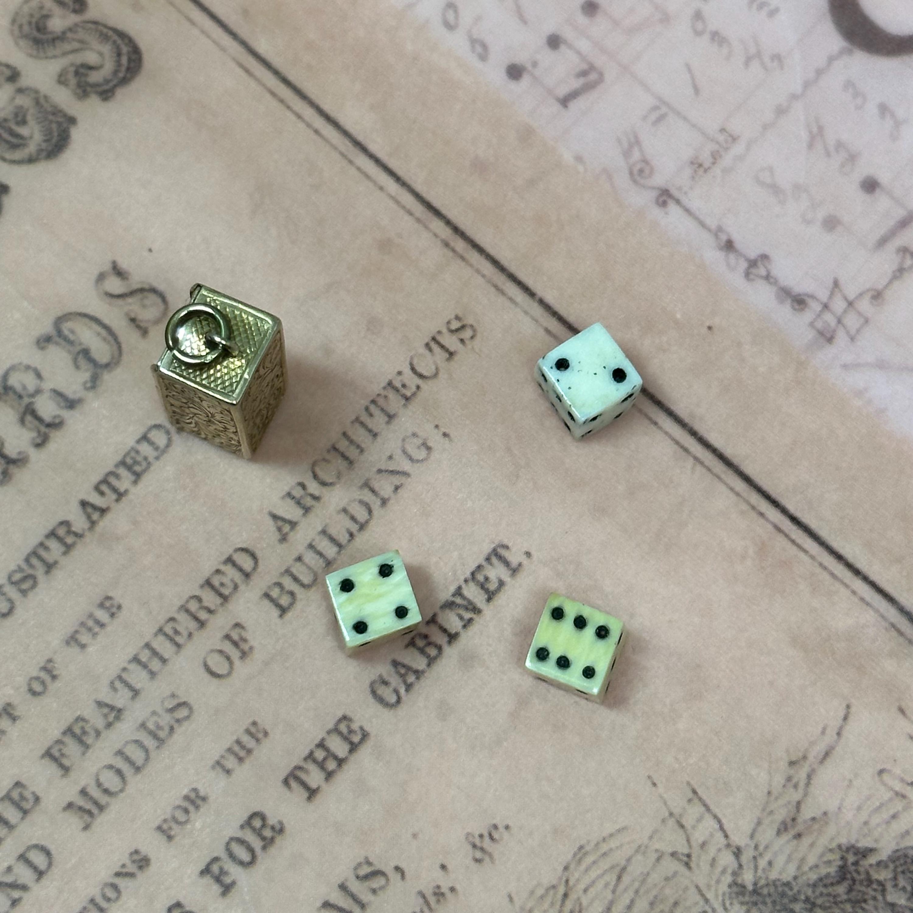 So special!! This tiny Victorian Dice box is just gorgeous !! It has detailed engravings in all sides. The engravings are crisp and craftsmanship is top notch. Come with three original dices. Condition of the piece is very good with patina matching its age. The panel opens and closes nicely and securely. It is not stamped but was fully tested and guaranteed as 9ct gold.
