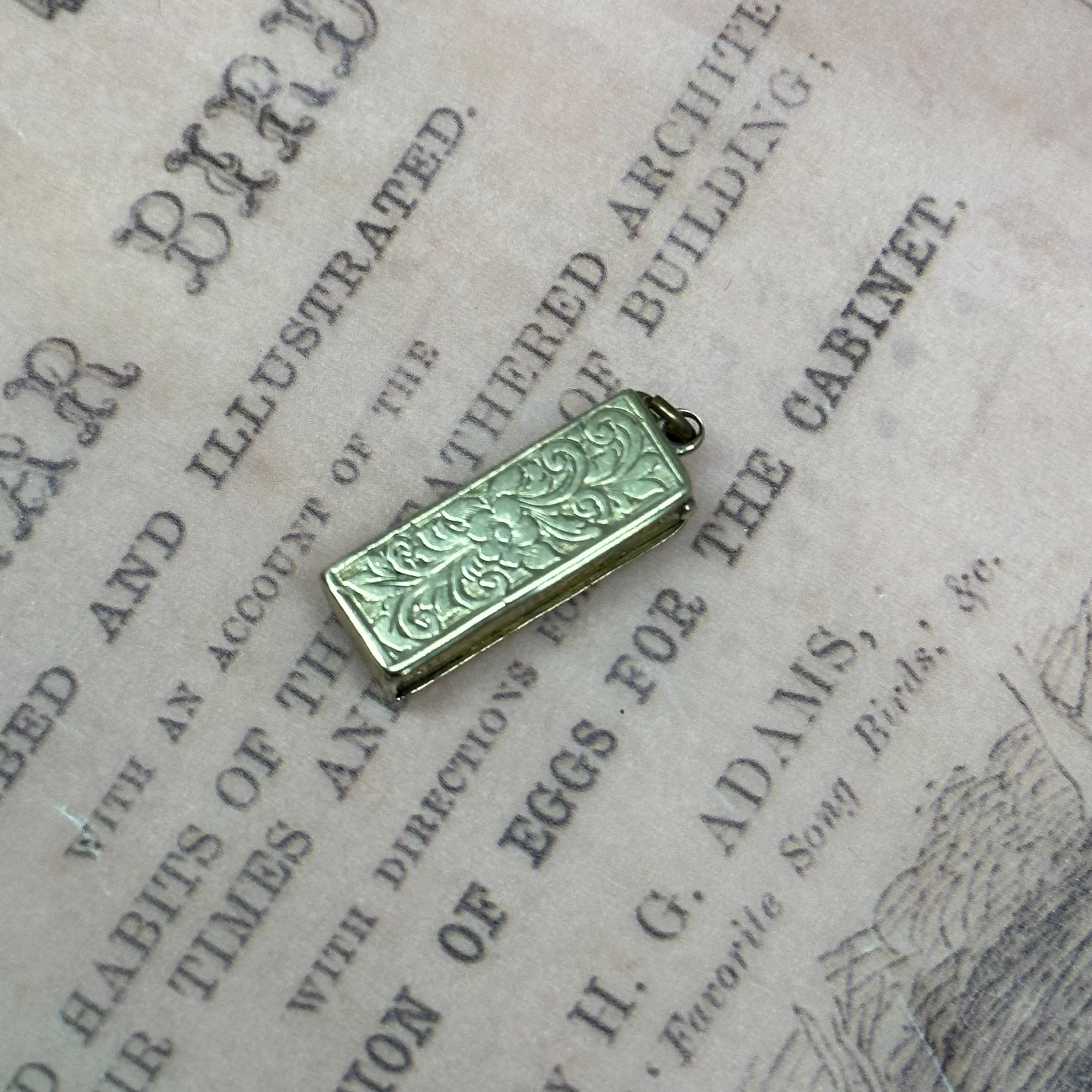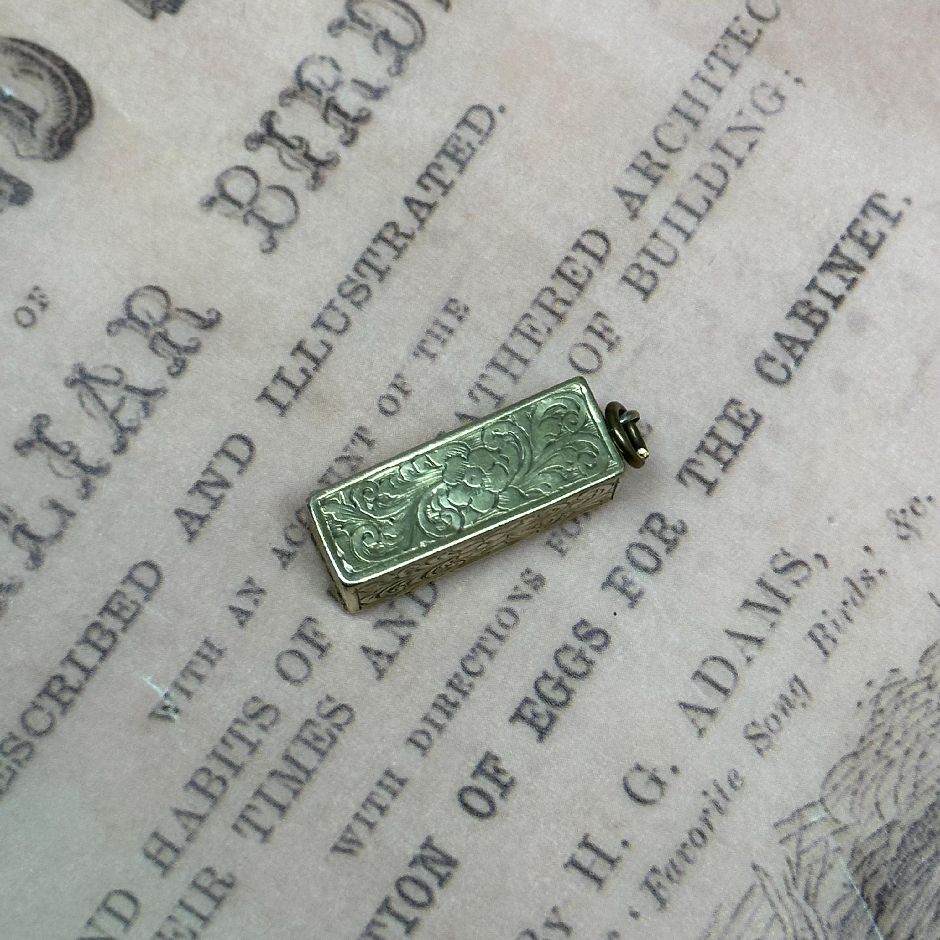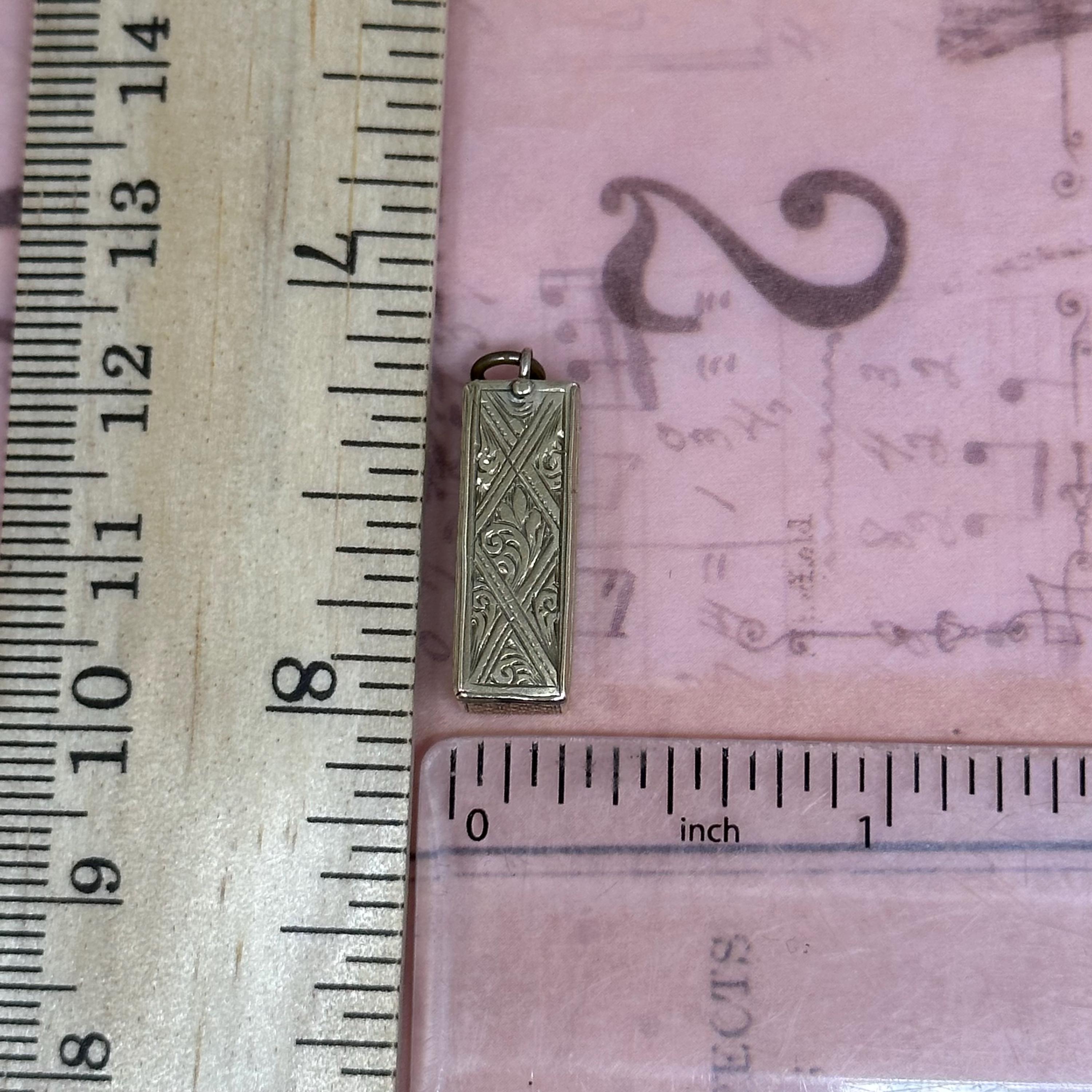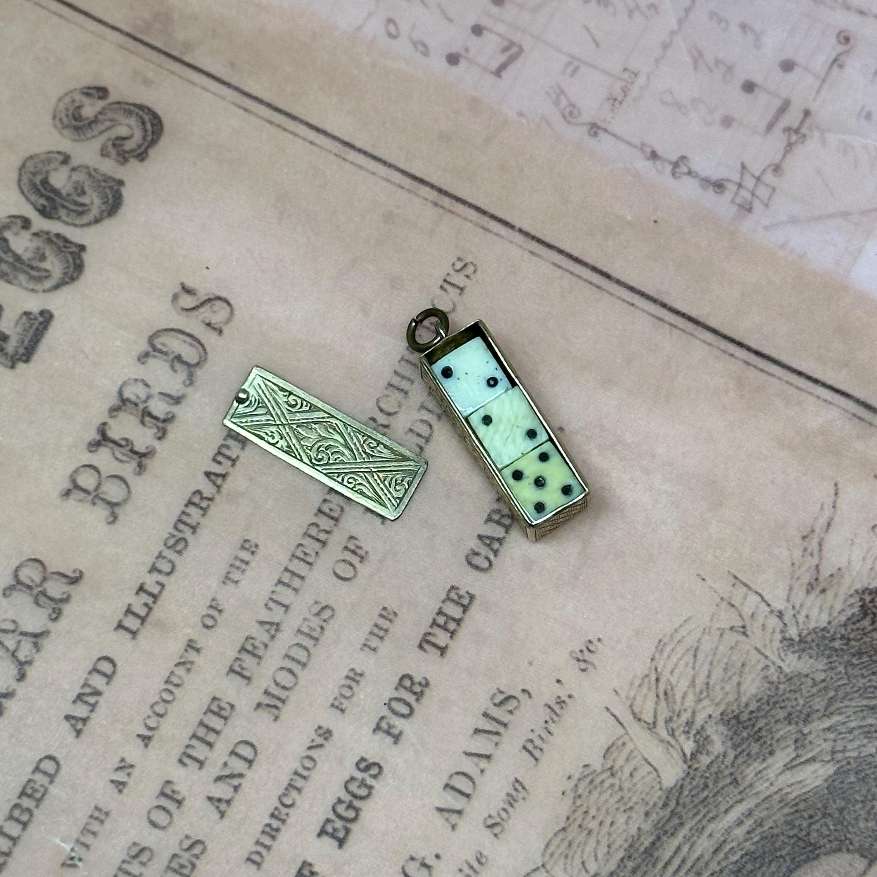 So special!! This tiny Victorian Dice box is just gorgeous !! It has detailed engravings in all sides. The engravings are crisp and craftsmanship is top notch. Come with three original dices. Condition of the piece is very good with patina matching its age. The panel opens and closes nicely and securely. It is not stamped but was fully tested and guaranteed as 9ct gold.
