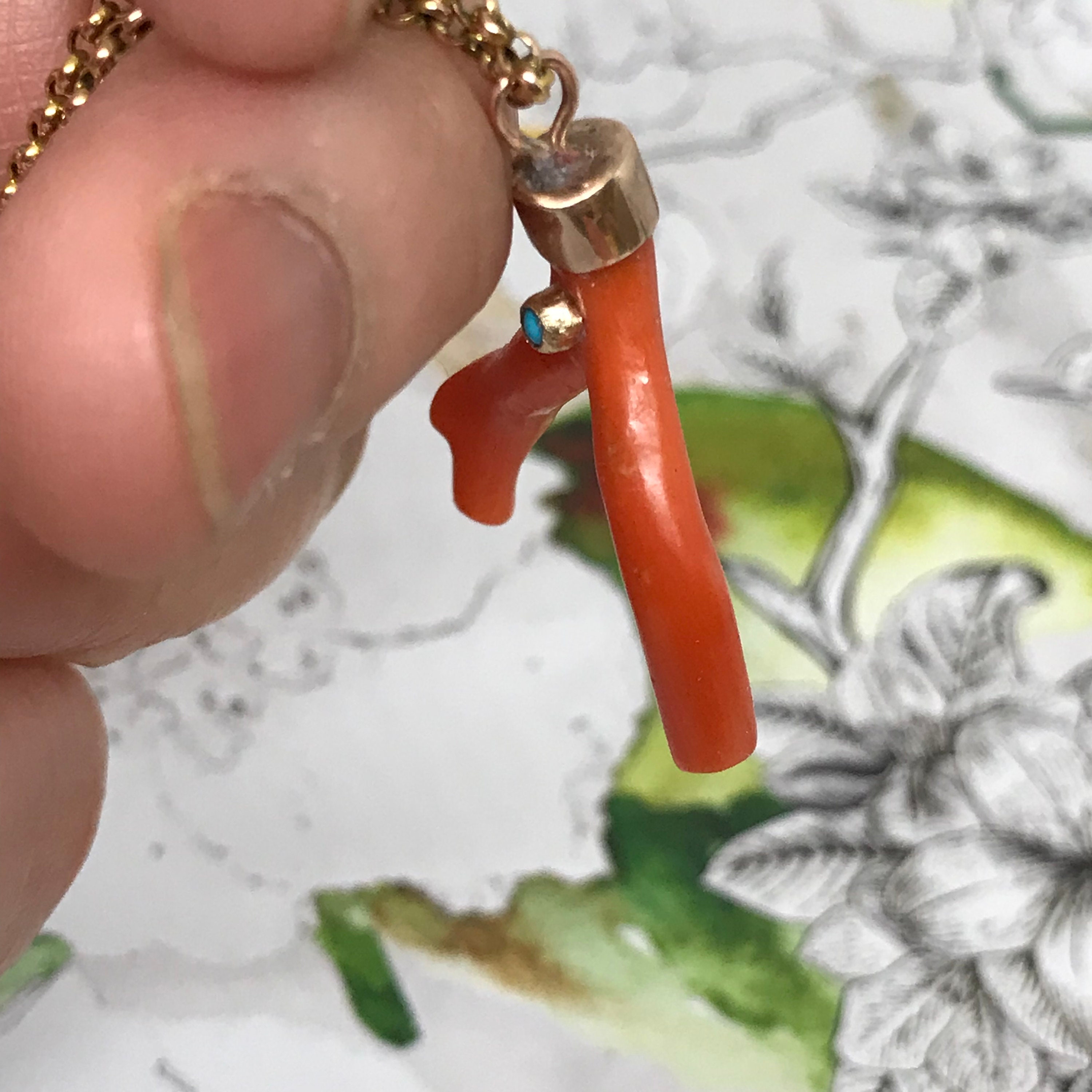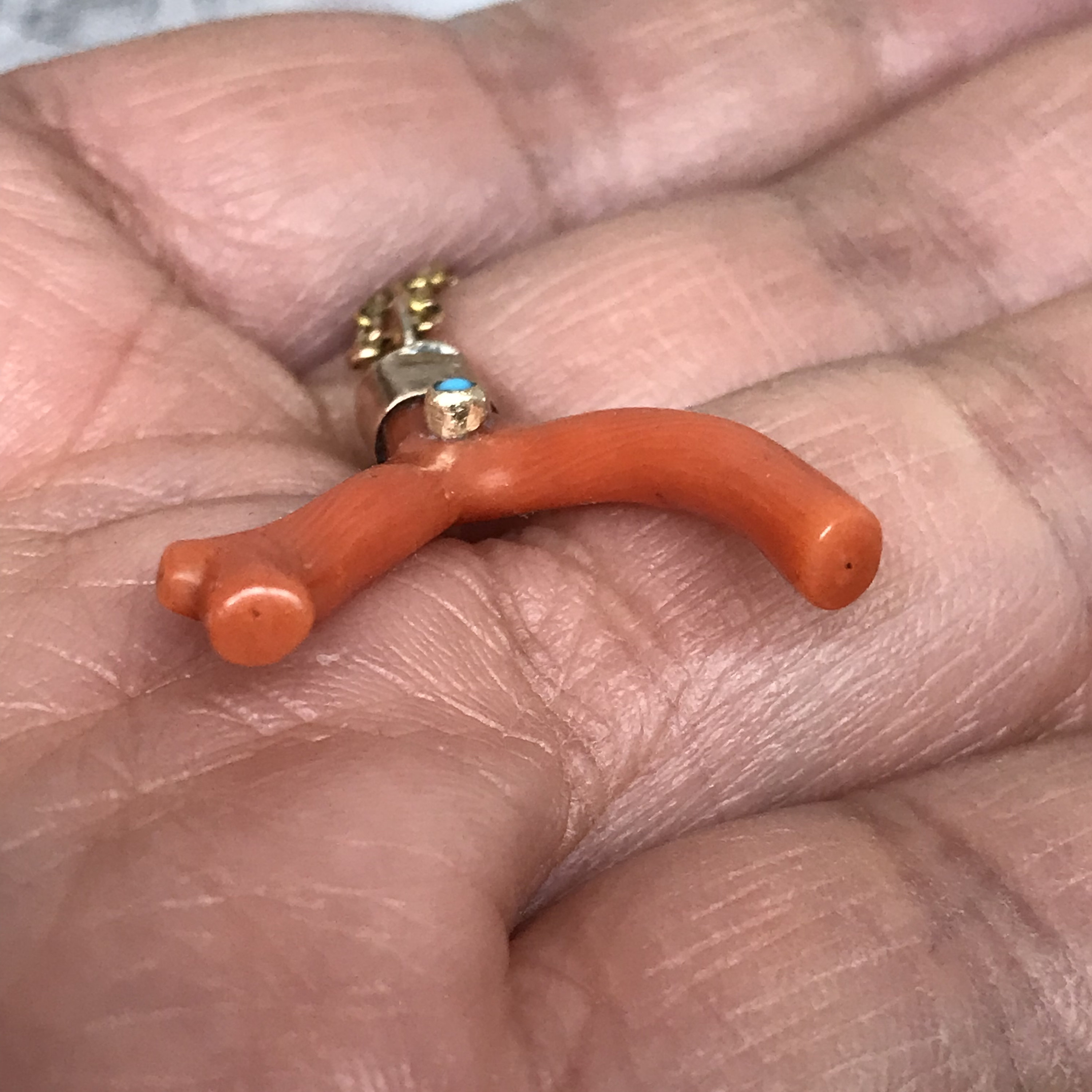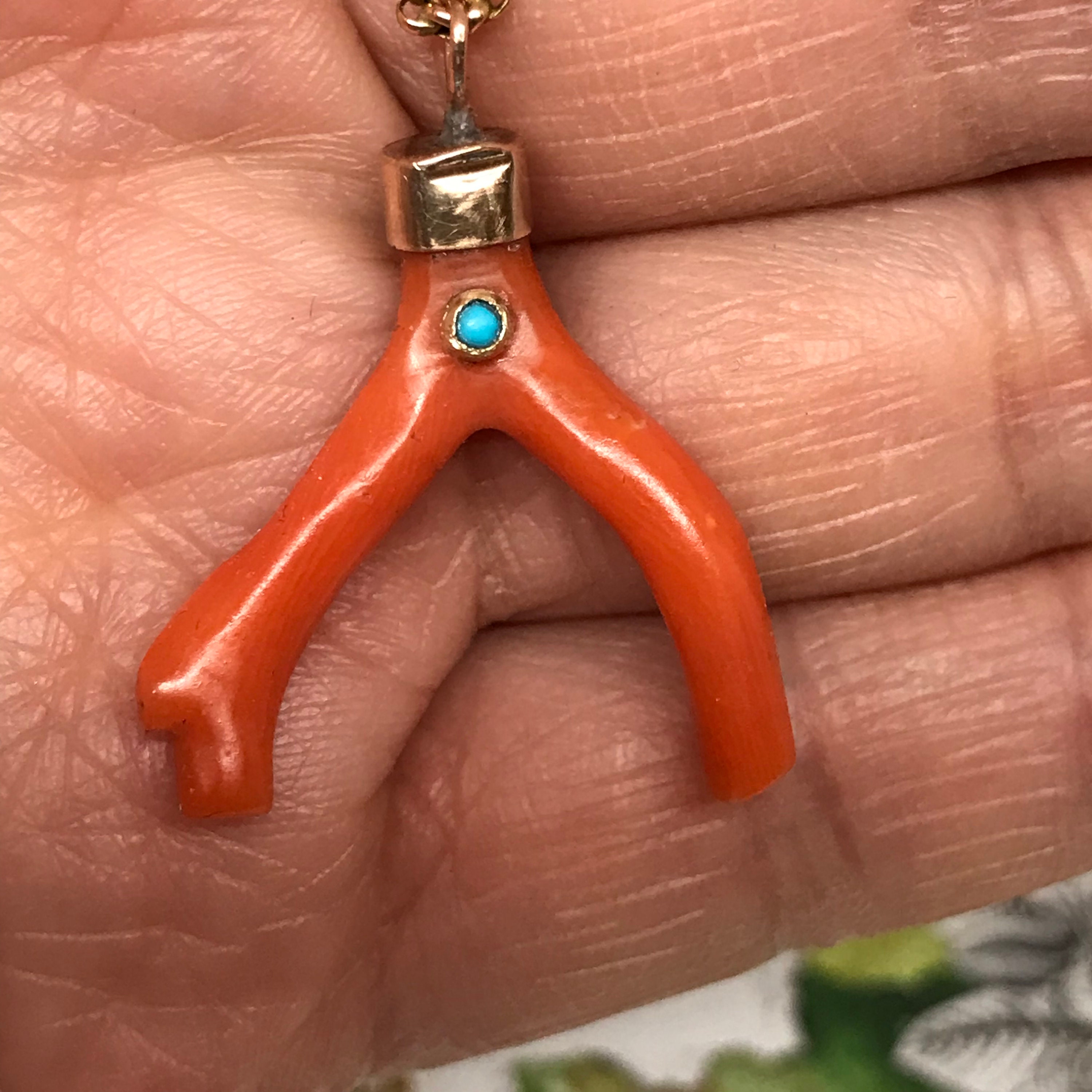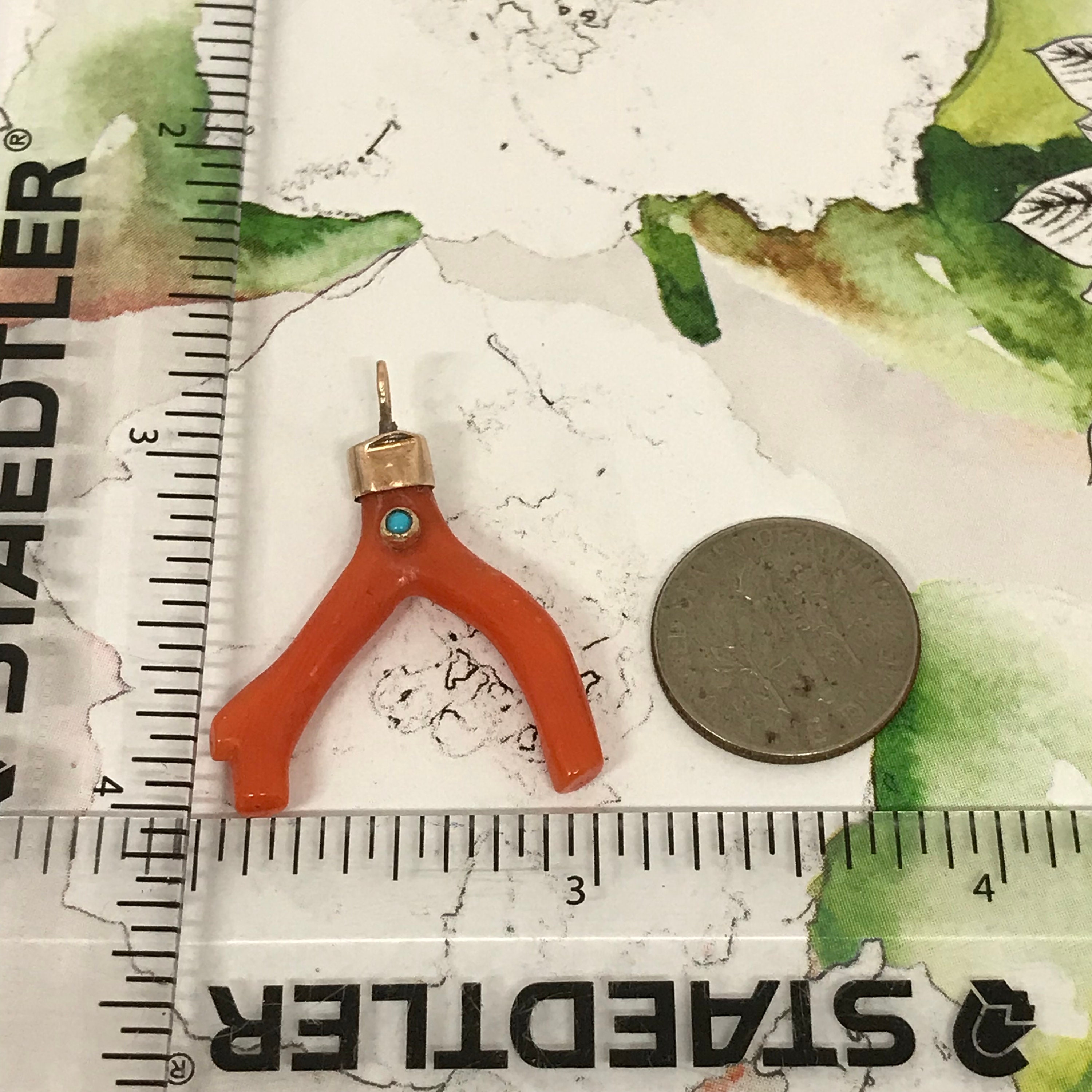 This Antique Coral Wish Bone Charm pendant is gorgeous!! The color is vivid salmon orange red, natural color, not dyed, with natural sheen throughout. It adorns with a 2mm natural Turquoise cabochon in the middle. The cap is not marked but tested 10k rose gold. A very charming piece that not seen often.